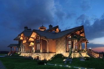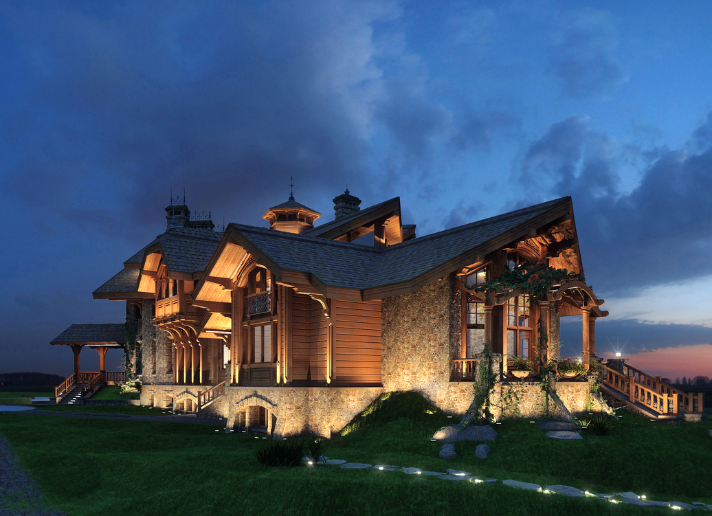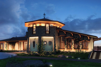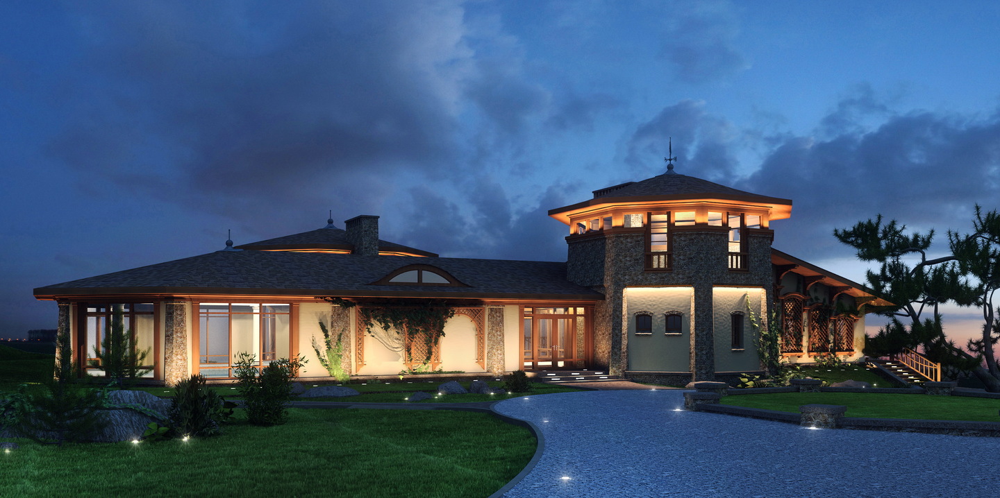 The basement level accommodates service and technical facilities. The ground floor is residential and includes: an entrance hall with staircase, a multifunctional living hall, a kitchen-dining area, and bedrooms. The double-height living room is oriented with its main glazed façade toward the estate’s park complex. The second floor contains guest rooms with walk-in closets and bathrooms, as well as a study with a library. All rooms are integrated with a system of open and covered terraces that extend toward the lake shore.