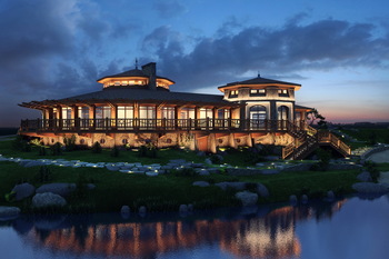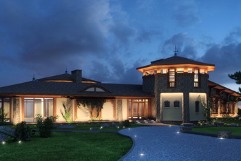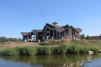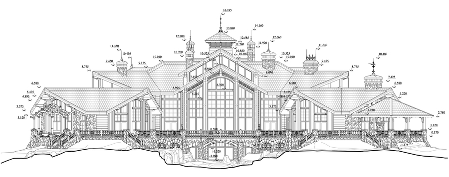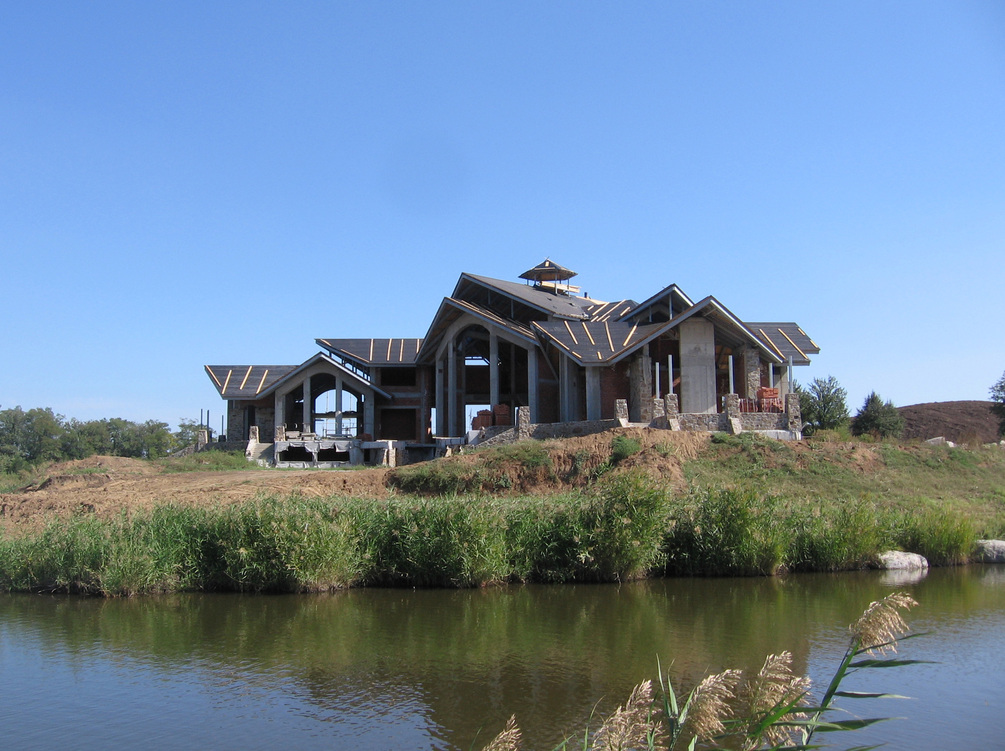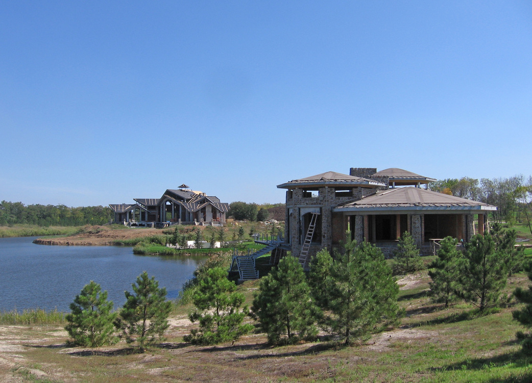 The residential house is composed with a complex symmetrical-axial layout. The building consists of a system of diverse, interconnected volumes. The central part of the structure is two stories high, while the side wings are single-story. Along the main axis of the building, at the basement level, a cascading stream flows into the lake. A pedestrian bridge crosses the stream, linking the western and eastern terraces.