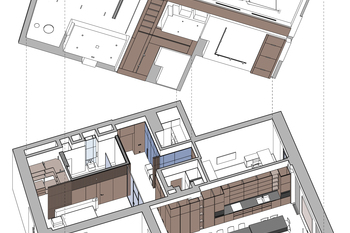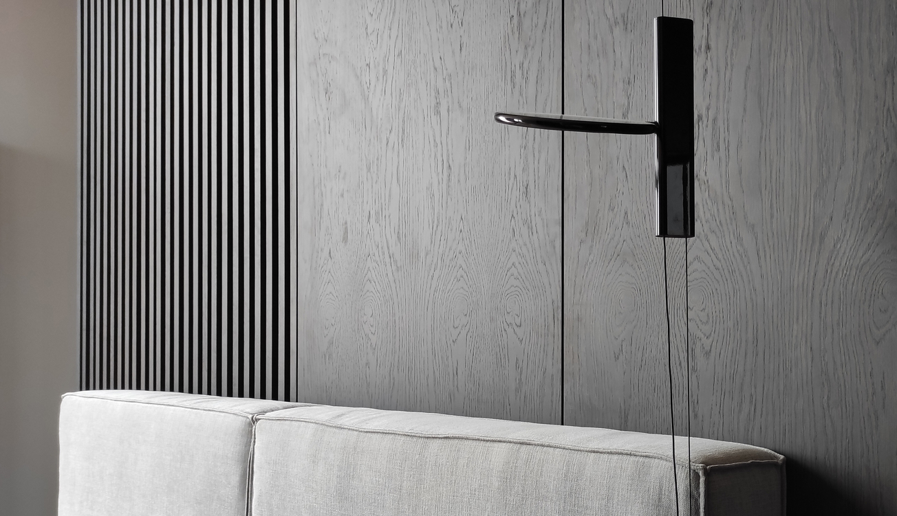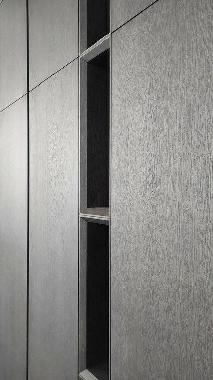 The apartment features a restrained color palette, with dark oak veneer, parquet flooring, porcelain stoneware resembling concrete, and natural stone.