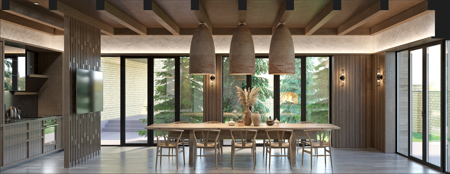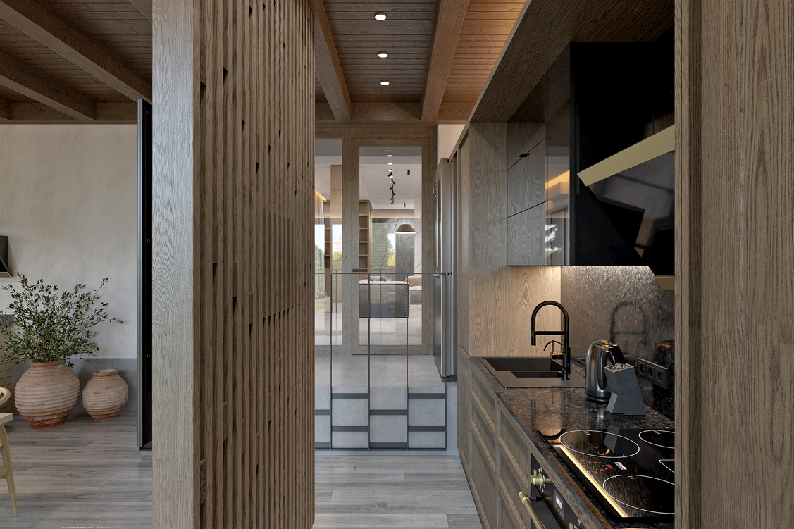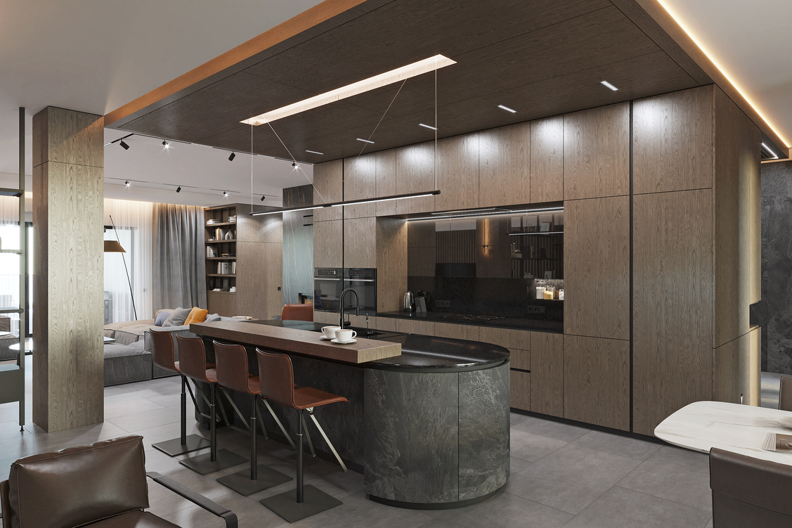 Зону кухні підкреслює шпонований дерев’яний плафон з вбудованим освітленням, який додає інтер’єру глибини та затишку.