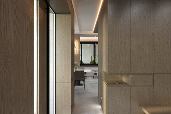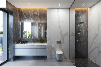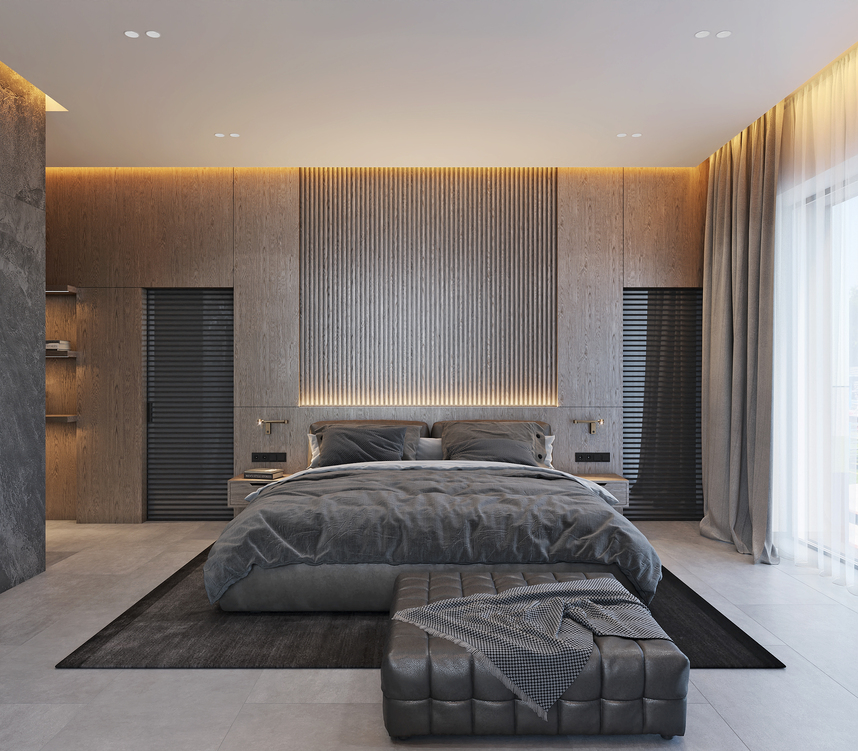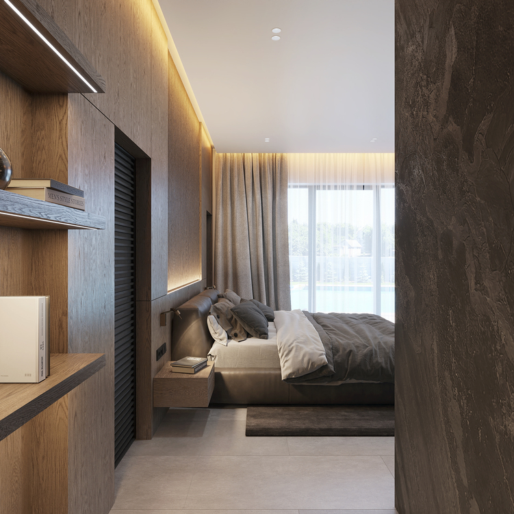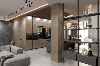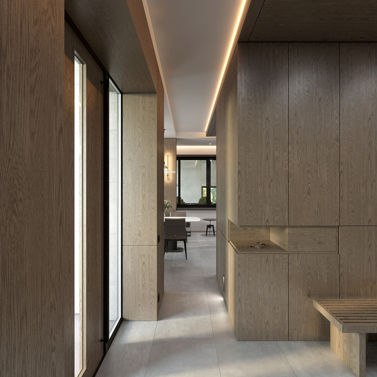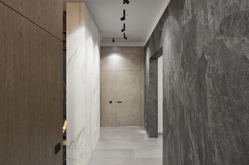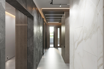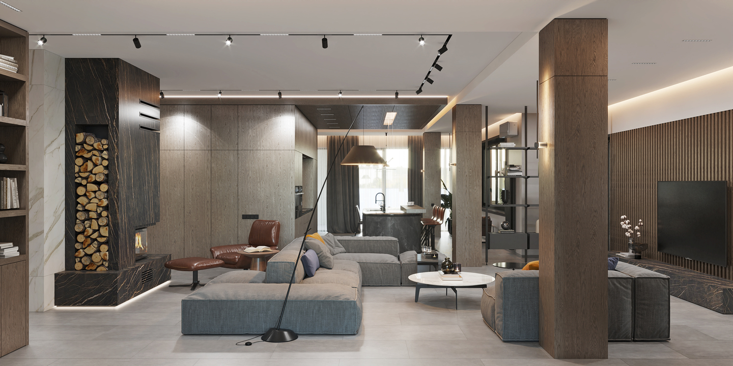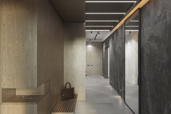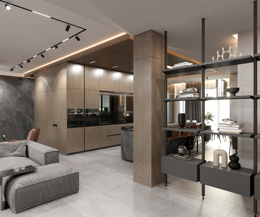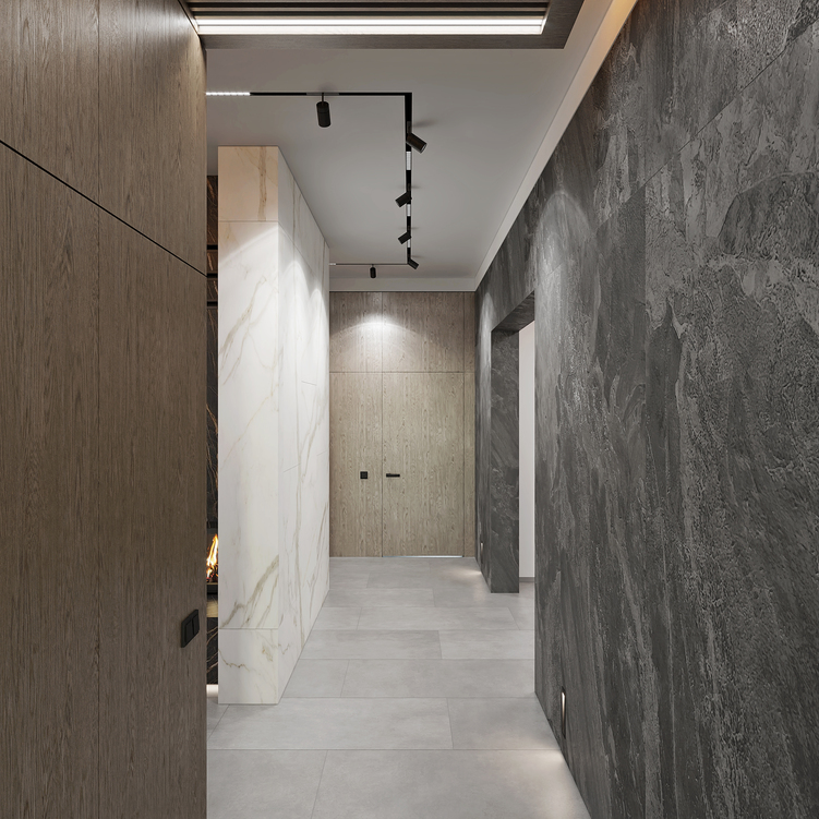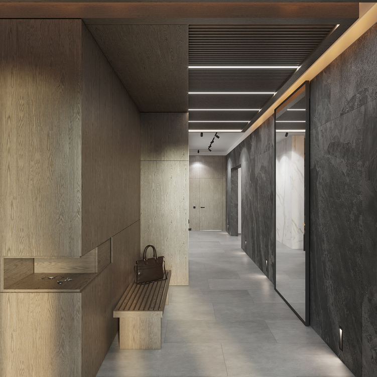 Шпоновані дерев’яні панелі, кам’яні фактури та великоформатний керамограніт формують стильний і лаконічний простір.
