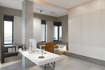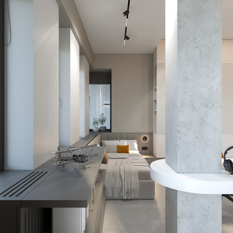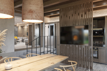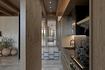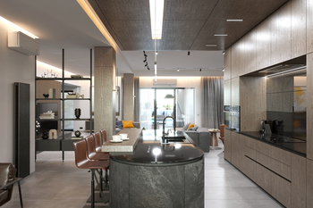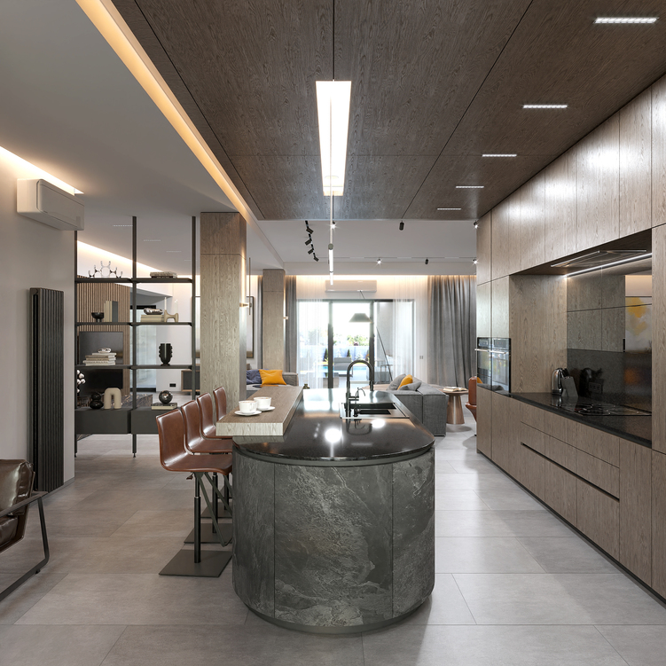 Головним акцентом у спільній зоні вітальні-студії є об’єм сходової клітини, який поєднує в собі шафи передпокою з одного боку та вбудовані кухонні меблі з іншого. У центрі кухні розташований острів зі стільницею з кварциту та дерев’яною накладкою, що додає тепла і тактильності. Нижня частина острова облицьована кам’яним шпоном, створюючи відчуття монолітності та міцності.