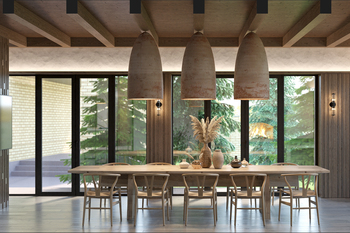 Інтер’єр будинку виконаний у сучасному стилі з теплим, природним настроєм.