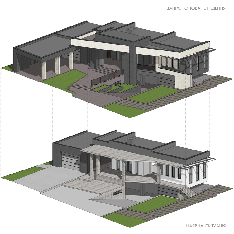 Опираючись на наявну структуру, ми запропонували рішення, яке максимально нівелює хаотичне та композиційно невдале розташування конструктивних елементів. Основною ідеєю стало створення виразного горизонтального акценту, роль якого виконує широкий парапет плаского даху у світлому оздобленні. Він візуально «накриває» більш складний об’єм будинку, облицьований темним керамогранітом.