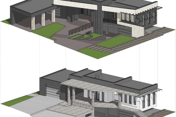 З огляду на особливості ділянки, край якої розташований під кутом до фронтальної лінії будинку, було вирішено використати дзеркальні кути покрівель. Покрівля навісу для авто завершується скошеним краєм, паралельним межі ділянки, а головний дах будинку повторює цей кут у протилежному напрямку, створюючи динамічну композицію.