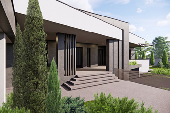 Ключовим акцентом фасаду став масивний об’єм, що візуально нагадує «куб», який перетинає покрівлю та формує виразний вхідний вузол. Його внутрішній простір вирішено уступами, що візуально «запрошують» до будинку та підкреслюють головний вхід.