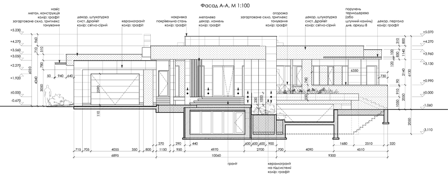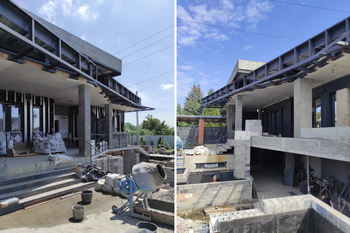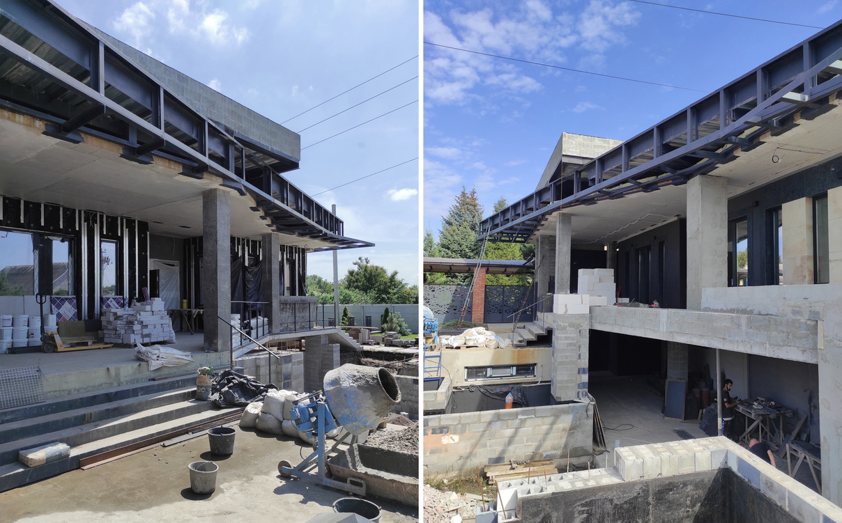 Окрему увагу приділено корекції елементів, які виглядали не тектонічно. Зокрема, бетонну колону на консольній терасі над цокольним поверхом ми об’єднали зі стінкою бокових сходів у єдиний елемент у світлому оздобленні. Це дозволило усунути випадковість у сприйнятті фасаду та зробити його більш логічним і структурним.