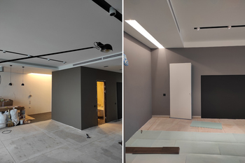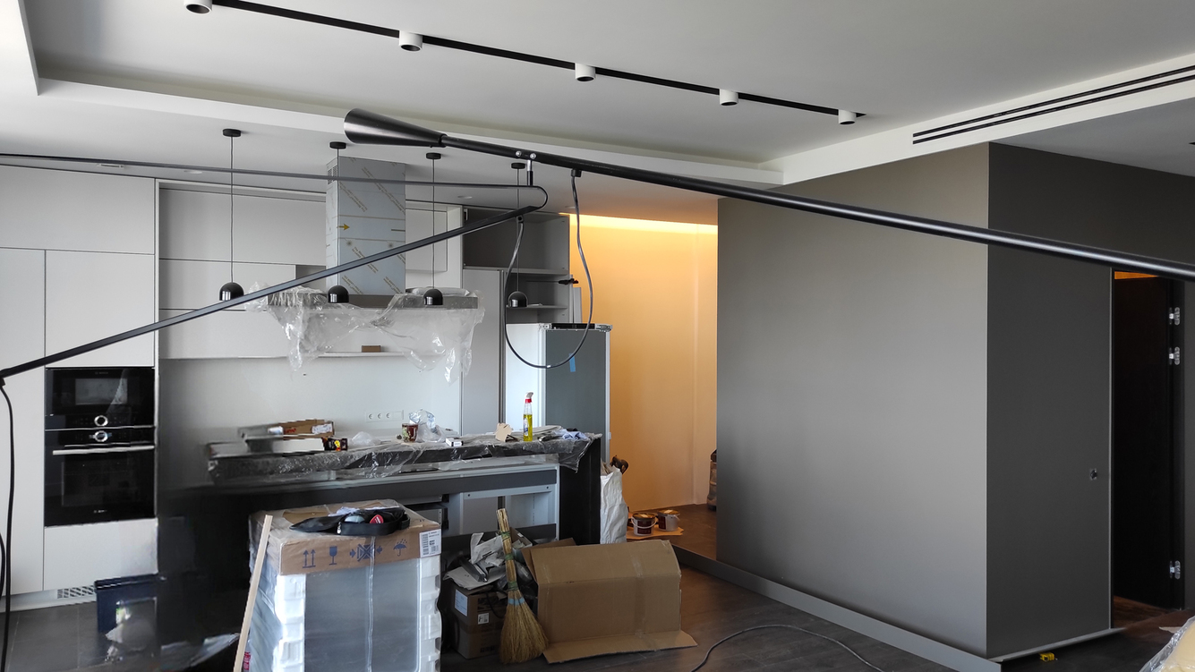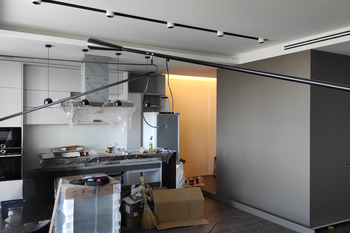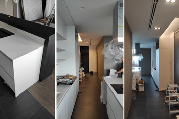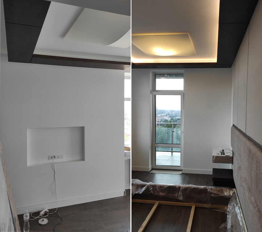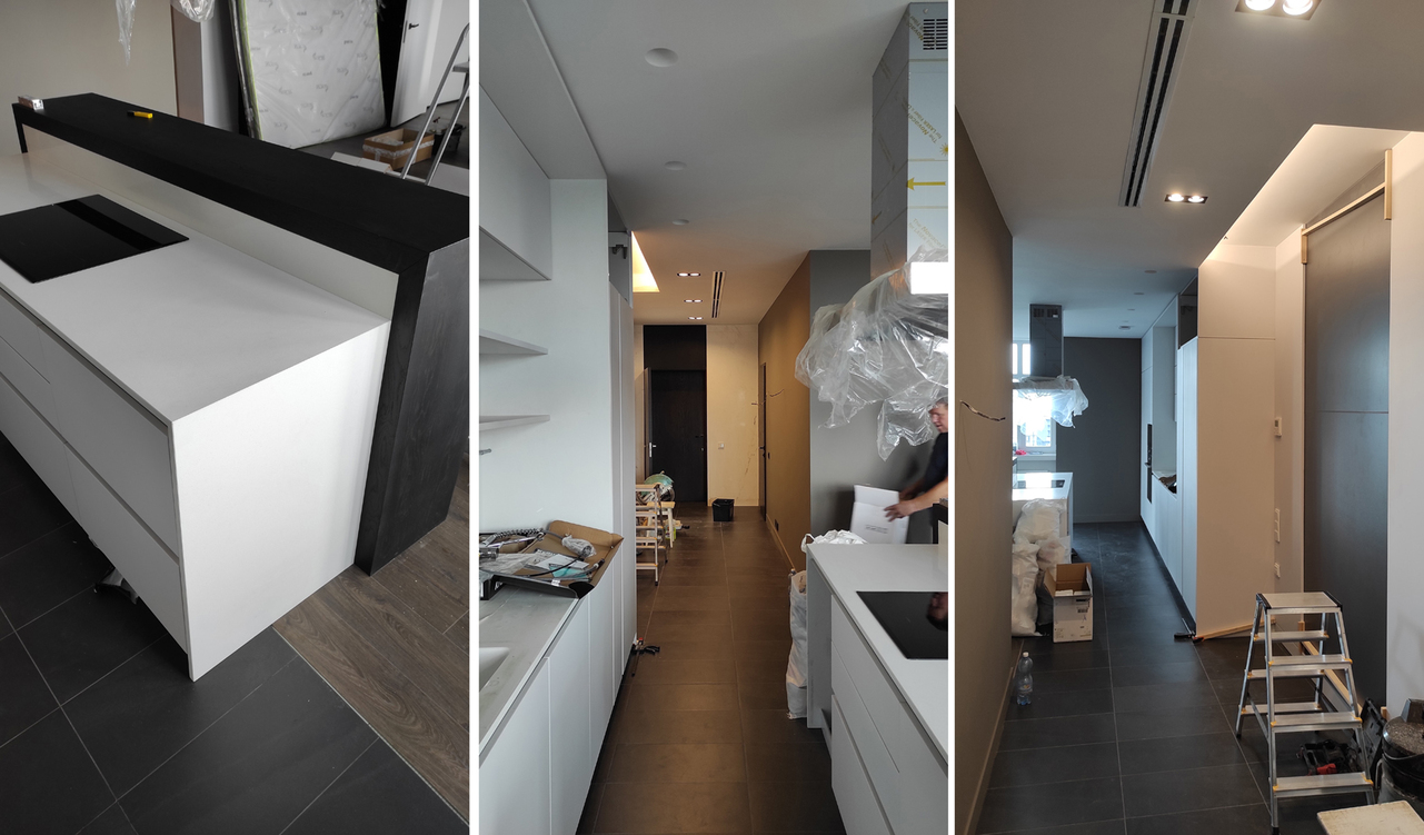 Квартира для сім'ї із трьох осіб. Планування включає: вітальню-студію, спальню батьків, кабінет та дитячу кімнату. У глибині квартири, в один об'єм, зібрані: ванна кімната, гостьовий санвузол та пральна. Це рішення дозволило зосередити основні “мокрі процеси” в одному місці. Цей об'єм облицьований шпонованими дерев'яними панелями, в які вписані двері прихованого монтажу. Вбудовані меблі виготовлені за індивідуальним замовленням з фарбованого та шпонованого мдф, стільниці та підвіконня зі штучного каменю. В обробці підлоги використаний керамограніт насиченого темно-сірого відтінку та паркетна дошка з активною текстурою.