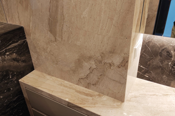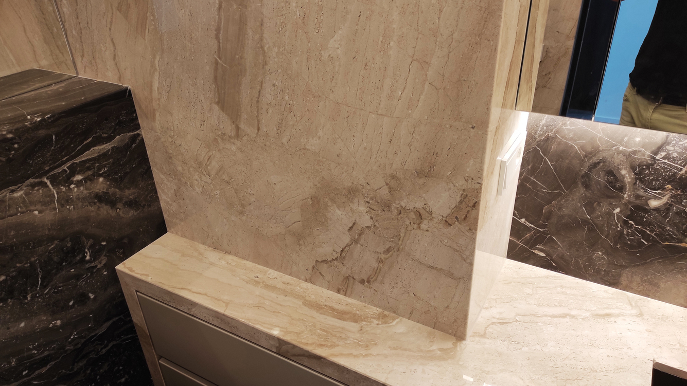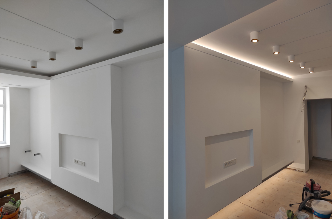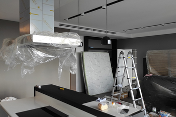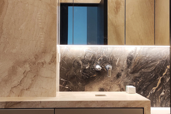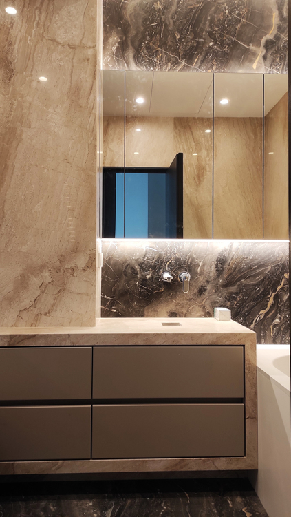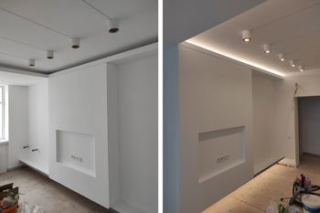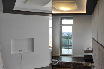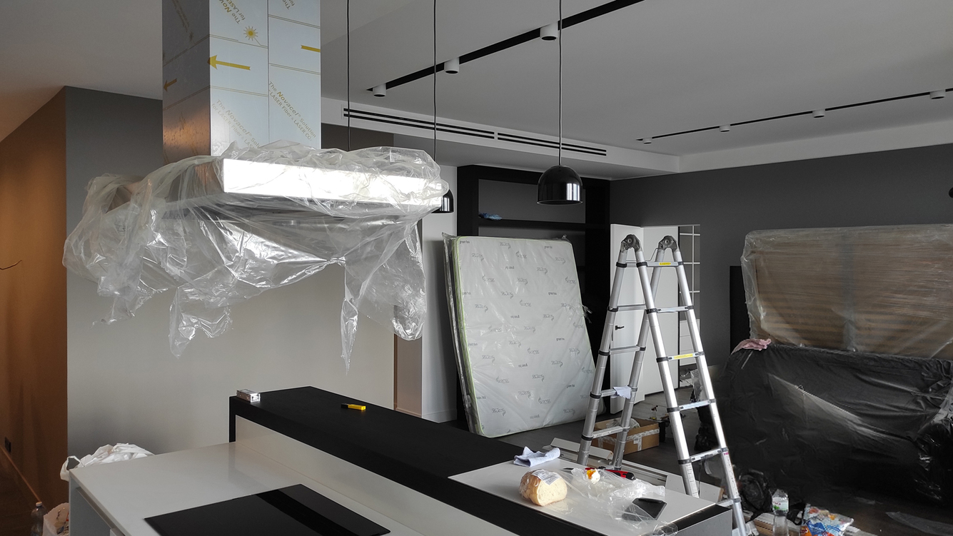 Квартира для сім'ї із трьох осіб. Планування включає: вітальню-студію, спальню батьків, кабінет та дитячу кімнату. У глибині квартири, в один об'єм, зібрані: ванна кімната, гостьовий санвузол та пральна. Це рішення дозволило зосередити основні “мокрі процеси” в одному місці. Цей об'єм облицьований шпонованими дерев'яними панелями, в які вписані двері прихованого монтажу. Вбудовані меблі виготовлені за індивідуальним замовленням з фарбованого та шпонованого мдф, стільниці та підвіконня зі штучного каменю. В обробці підлоги використаний керамограніт насиченого темно-сірого відтінку та паркетна дошка з активною текстурою.