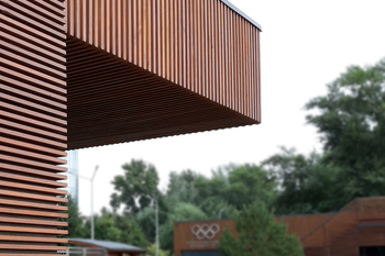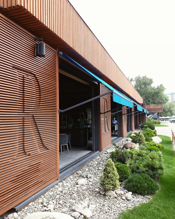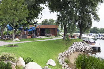 Зовнішні стіни обідньої зали виконані у вигляді розсувних вітражних систем, що дозволяє в гарну погоду повністю відкрити внутрішній простір ресторану до річки та парку.