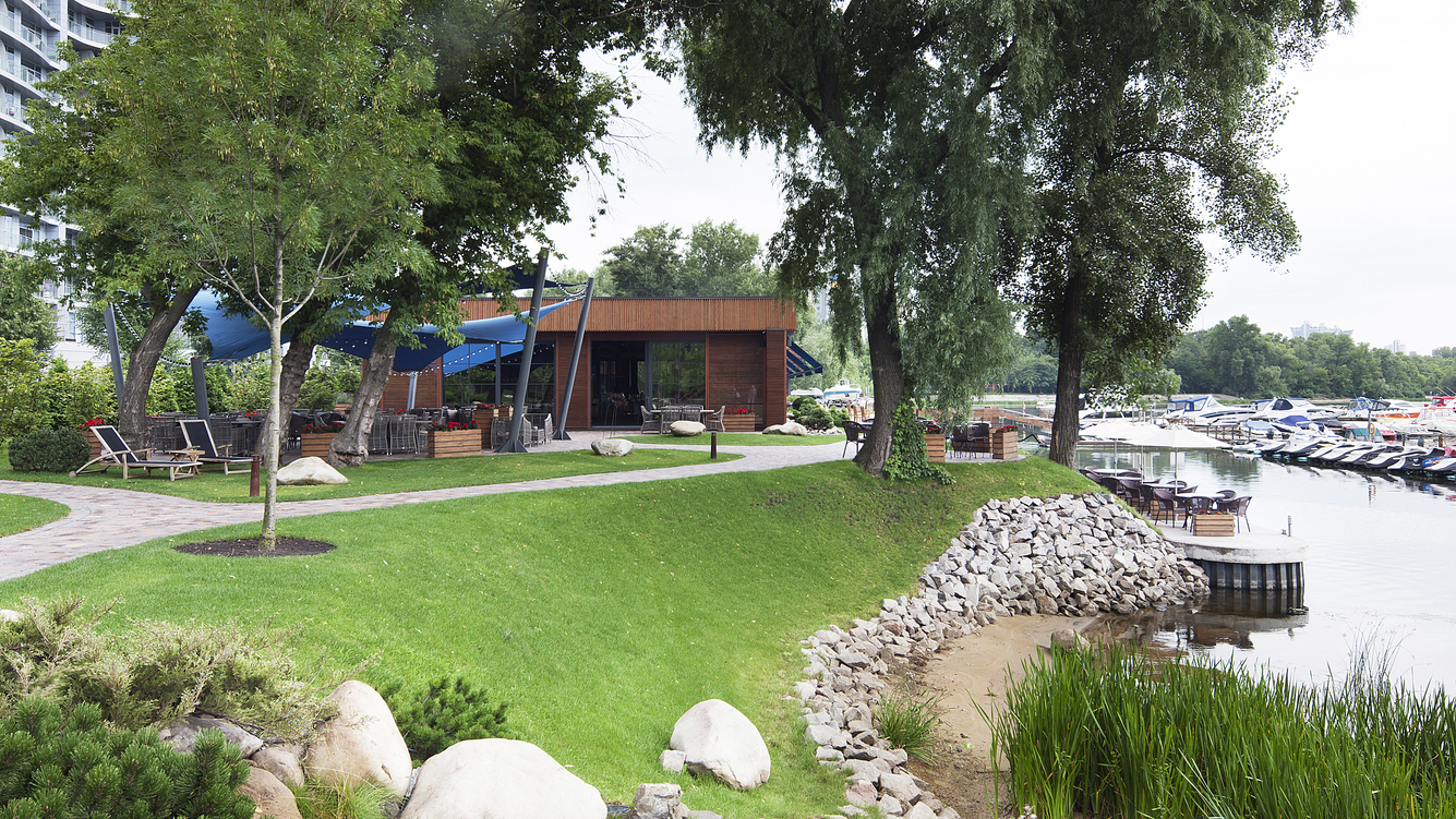Будівля ресторану знаходиться в центральній частині ділянки, орієнтована паралельно лінії берега.