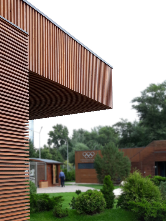 Об'єм будівлі виконано у формі прямокутного паралелепіпеда з прилеглою літньою терасою.
